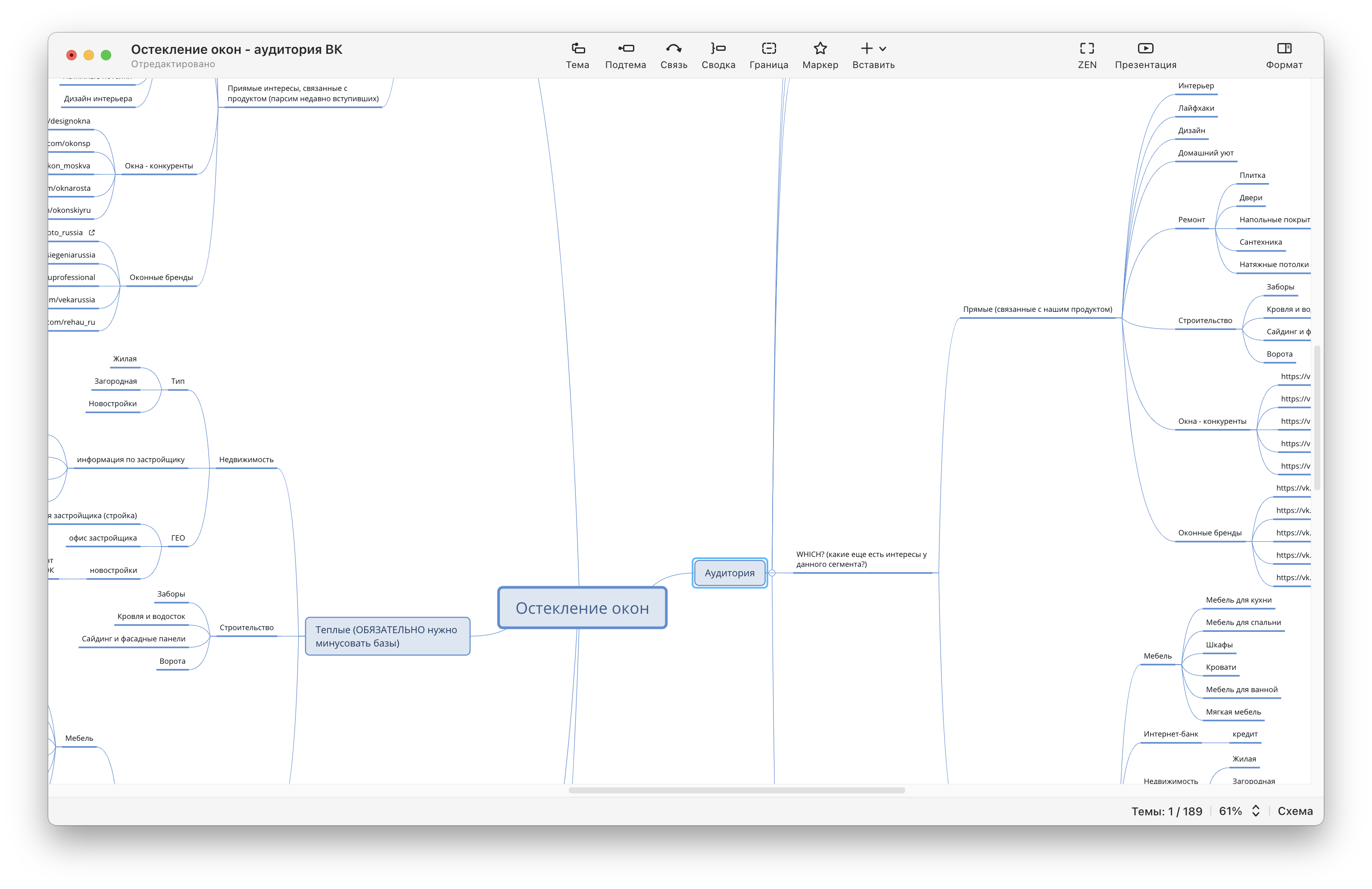 Этими данными мы пользуемся до сих пор. Когда запускаем новое направление (например, зимние сады), мы просто открываем тот MindMap с исследованием.